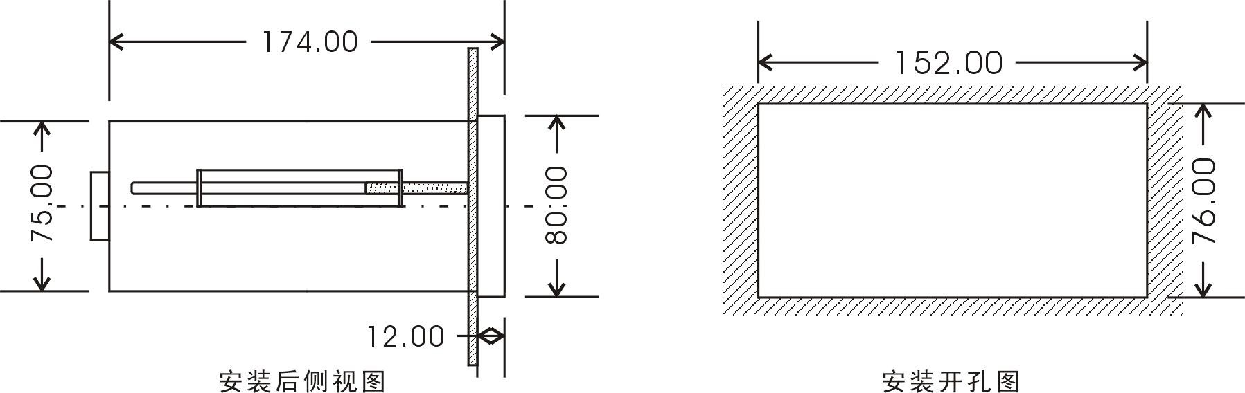 1)控制屏上开 152×76mm 矩形孔,将产品从正面装入孔内,将固定支架从仪表后面两侧固定。