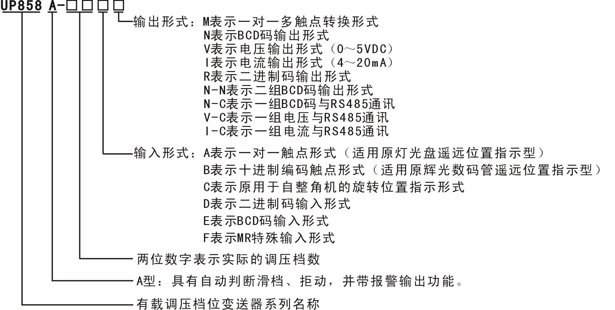 可根据不同用户的要求或不同型号的分接开关操作机构,变换 UP858A 系列产品的输入量,即可以是原灯光盘或数码管的多路滑档触点信号,也可以是原自整角机的旋转位置改制的角度传感信号或不同阻值的电阻信号,输出量可以是经高度隔离转换后的无源触点一对一信号,也可以是 BCD 码信号,二进制编码信号或电压输出信号。特别是电压输出型,综合自动化装置的 RTU 只需将它作为一个遥测量来对待,仅需进行标度转换后显示相应的整数值即可。这种方式连接电缆最少,接口简单,电压分档识别余度大,输出转换稳定可靠。可与遵仪长征、吴江、上海华明开关厂、德国 MR 和瑞典 ABB 等多种型号的有载调压分接开关的操作机构进行电气连接应用,由于此种仪器小巧,多功能,不仅适用于变电站改造更新,而且在设计新变电站时可省去专用的调压控制屏。